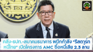 - คลัง–ธปท.–สมาคมธนาคาร ผนึกกำลัง “รีสตาร์ทหนี้ไทย” เปิดโครงการ AMC ซื้อหนี้เสีย 2.3 ล้านบัญชี มูลค่า 6.2 หมื่นล้านบาท ฟื้นคนไทยจากวิกฤตหนี้ครัวเรือน
