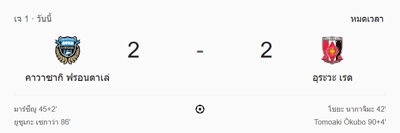 - จบเกม: คาวาซากิ ฟรอนตาเล่ เสมอ อุราวะ เรด ไดมอนส์ 2-2