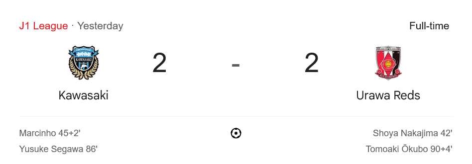 จาก : ผลบอลสด เจลีก ดิวิชัน 1 2025 ระหว่าง คาวาซากิ ฟรอนตาเล่ 2-2 อูราวะ เรด ไดมอนส์ วันนี้ 21/5/68 – บ้านกีฬา