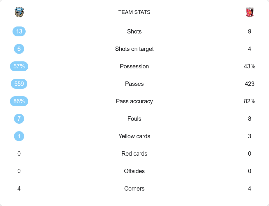 เกมนี้ คาวาซากิ ครองบอลเหนือกว่าที่ 57% เทียบกับ 43% ของอูราวะ และมีจำนวนผ่านบอลถึง 559 ครั้ง มากกว่าอูราวะที่ผ่านบอลเพียง 423 ครั้ง ความแม่นยำในการผ่านบอลของเจ้าถิ่นอยู่ที่ 86% ส่วนทีมเยือนทำได้ที่ 82% โอกาสยิงของคาวาซากิมากกว่าเล็กน้อยที่ 13 ครั้ง เข้ากรอบ 6 ส่วนอูราวะยิง 9 เข้ากรอบ 4 ทั้งสองทีมเล่นเกมรับได้ดี มีใบเหลืองเพียงเล็กน้อย คาวาซากิ 1 ใบ ส่วนอูราวะ 3 ใบ เกมนี้ไร้ใบแดง และการล้ำหน้าก็ไม่มีเกิดขึ้นเลย แสดงให้เห็นถึงความมีวินัยในการยืนไลน์ของทั้งสองทีม