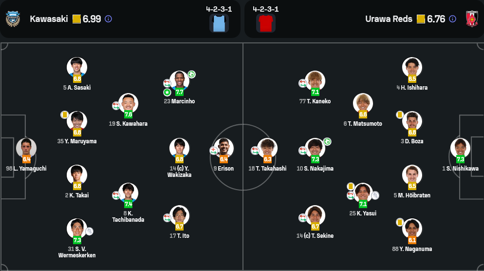 ทั้งสองทีมมาในแผนเดียวกันคือ 4-2-3-1 ซึ่งเน้นการต่อบอลจากแดนกลางและอาศัยการซ้อนของตัวริมเส้นอย่างหนัก ฝั่งคาวาซากิเน้นบุกทางกราบซ้ายผ่านมาร์ซินโญ่และซาซากิ โดยอาศัยสปีดและเทคนิคเฉพาะตัวของมิดฟิลด์ฝั่งนี้ได้ดีมาก เกมรุกดุดัน ใช้การเจาะจากกลางผสมกับการครอสจากริมเส้น ทำให้การครองบอลได้ถึง 57% และมีความแม่นยำในการจ่ายบอลถึง 86% ด้านอูราวะแม้จะครองบอลน้อยกว่า แต่มีความแม่นในการเล่นสวนกลับ โดยเฉพาะจากโอกุโบะและนาคาจิมะที่แสดงให้เห็นถึงคุณภาพการจบสกอร์ในพื้นที่แคบ การ วิเคราะห์บอล เกมนี้จึงชี้ว่าความสมดุลของแผนการเล่นชัดเจนในรูปแบบครองบอลปะทะเกมสวน แต่แนวรับของทั้งสองฝั่งยังมีช่องให้โจมตีซึ่งส่งผลให้สกอร์ออกมาแบบนี้
