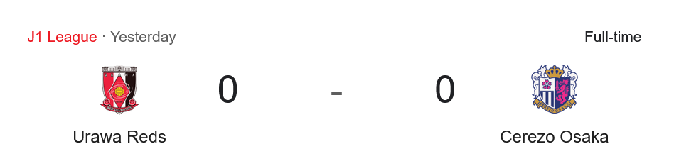 ศึกฟุตบอลเจลีก ดิวิชัน 1 ฤดูกาล เมื่อวันที่ 28 พฤษภาคมที่ผ่านมา จบลงแบบไร้ผู้ชนะ เมื่อ เซเรโซ โอซาก้า บุกไปยันเสมอ อูราวะ เรด ไดมอนส์ ถึงถิ่นไซตามะ สเตเดียม ด้วยสกอร์ 0-0 โดยในเกมนี้แม้ไม่มีประตูเกิดขึ้น แต่กลับเต็มไปด้วยจังหวะเข้าทำสุดดุเดือดและการป้องกันระดับมาสเตอร์คลาส โดยเฉพาะจากฝั่งทีมเยือนที่มีนายด่านมือหนึบโชว์ฟอร์มสุดหนึบเกินต้าน ผลการแข่งขันนี้ส่งผลให้ทั้งสองทีมเก็บแต้มเพิ่มฝั่งละ 1 คะแนน ซึ่งส่งผลต่อการขยับอันดับในตารางพอสมควร ตามรายงาน ผลบอลสด จาก บ้านกีฬา