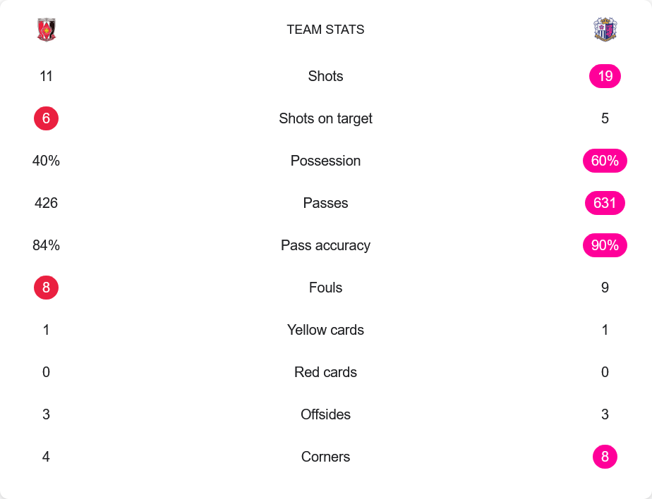 ด้าน เซเรโซ โอซาก้า เล่นอย่างมีวินัย มีการเปลี่ยนจังหวะเกมได้ดีและต่อบอลสั้นแม่นยำ ทำให้ครองเกมได้ถึง 60% การยืนตำแหน่งของแนวรับอย่าง ฮาตานากะ และนิชิโอะ ก็โดดเด่นมาก โดยเฉพาะผู้รักษาประตู ฟุคุอิ ที่โชว์เซฟระดับเทพหลายครั้ง เกมรุกแม้จะไม่เฉียบขาดมากนัก แต่ก็แสดงให้เห็นการประสานงานที่มีแบบแผนและสร้างโอกาสได้ต่อเนื่อง ถือเป็นการ วิเคราะห์บอล ที่ชี้ให้เห็นถึงความเหนียวแน่นและความแม่นยำของทีมเยือน