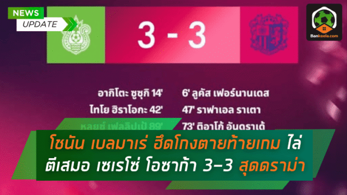 เกมนี้มันส์สะใจแฟนบอลทั้งสนาม! เซเรโซ่ โอซาก้า ทำสามแต้มลอยหายแบบเจ็บแสบ หลังโดน โชนัน เบลมาเร่ ฮึดสู้สุดใจจนตามตีเสมอในช่วงท้ายเกมจากจุดโทษ สุดท้ายจบด้วยผล 3-3 แบ่งแต้มกันไปแบบดราม่าขั้นสุด แม้รูปเกมจะผลัดกันนำผลัดกันตามตลอดทั้ง 90 นาที แต่เจ้าถิ่นยังต้องดิ้นรนหนีโซนตกชั้นต่อไป ขณะที่ทีมเยือนก็พลาดโอกาสขยับอันดับไปแบบน่าเสียดาย