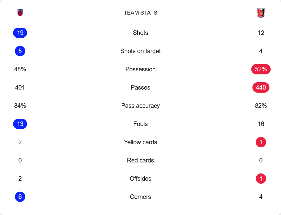 แม้จะครองบอลน้อยกว่าเล็กน้อยที่ 48% แต่โตเกียวสร้างสรรค์โอกาสยิงได้มากถึง 19 ครั้ง เข้ากรอบ 5 ขณะที่อูราวะยิง 12 ครั้ง เข้ากรอบ 4 ทั้งสองทีมเล่นกันดุดัน มีฟาวล์รวมกันถึง 29 ครั้ง โตเกียวได้เตะมุมมากกว่าที่ 6 ต่อ 4 และจ่ายบอลแม่นยำกว่าเล็กน้อยที่ 84% ต่อ 82%