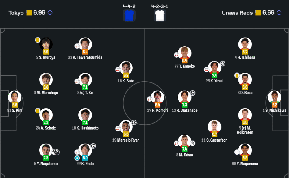 โตเกียวมาในแผน 4-4-2 ที่เน้นเกมรุกริมเส้นจากเอนโดะและนากาโตโมะ เติมเกมสูงตลอด พร้อมวางไรอันเป็นหน้าเป้าปั่นป่วนแนวรับอูราวะ ส่วนอูราวะเลือกใช้ 4-2-3-1 ตั้งรับแน่นแล้วโต้กลับเร็วผ่านยาสุอิและวาตานาเบะ ซึ่งทั้งสองทีมเปิดเกมสู้กันเต็มที่ตลอด 90 นาที ด้านการ วิเคราะห์บอล ชัดเจนว่าโตเกียวแก้เกมครึ่งหลังได้เฉียบขาด โดยเปลี่ยนตัวเสริมสปีดเกมรุกจนกลับมาแซงคว้าชัยได้สำเร็จ