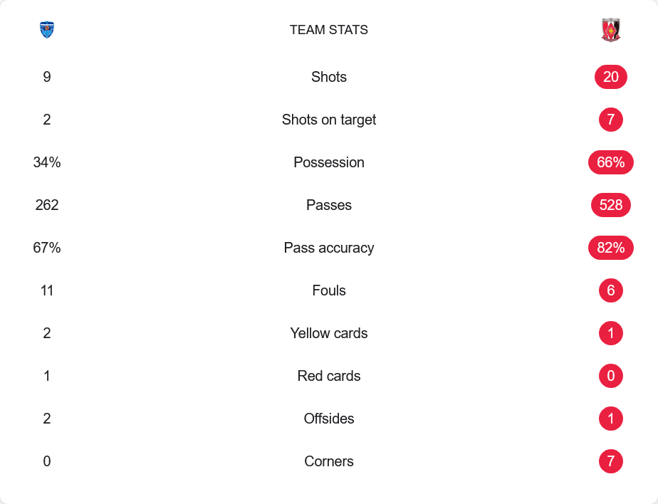 ตลอด 90 นาที อูราวะ เรด ไดมอนส์ครองบอลเหนือกว่า 66% ต่อ 34% จ่ายบอล 528 ต่อ 262 ครั้ง ความแม่นยำ 82% ต่อ 67% โอกาสยิงมากถึง 20 ต่อ 9 และยิงตรงกรอบ 7 ต่อ 2 เจ้าถิ่นไม่สามารถสร้างโอกาสจากลูกเตะมุมได้เลย ขณะที่อูราวะได้ 7 เตะมุม ทำฟาวล์น้อยกว่า (6 ต่อ 11) และล้ำหน้าหนึ่งครั้งตลอดเกม