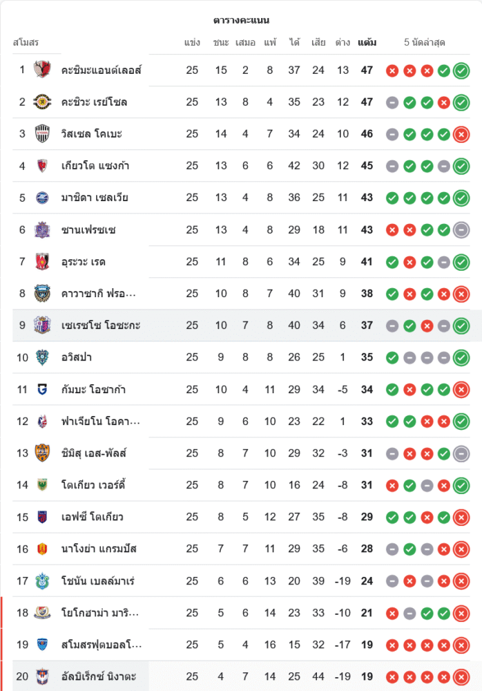 สามแต้มเกมนี้พาเซเรโซ โอซาก้า ขยับยึดอันดับ 9 ที่ 37 คะแนนจาก 25 นัด เกาะกลุ่มครึ่งบนพร้อมไล่กดดันพื้นที่ท็อป 7 ต่อไป ด้านอัลบิเร็กซ์ นิงาตะ สถานการณ์ยังหนัก รั้งอันดับ 20 บ๊วยของตารางที่ 19 คะแนน ต้องเร่งเครื่องด่วนหากไม่อยากติดหล่มโซนแดงยาว