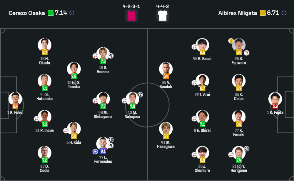 ลูคัส เฟอร์นันเดส (เซเรโซ โอซาก้า) เรตติ้ง 9.1 คือคนแบกเกมอย่างแท้จริง ยิงประตูแซง 2-1 นาที 54 และทำแอสซิสต์ให้ทีมตีเสมอในครึ่งแรก พลังวิ่ง ความดุดันหนึ่งต่อหนึ่ง และการตัดสินใจหน้าปากประตูคือความแตกต่างของแมตช์นี้