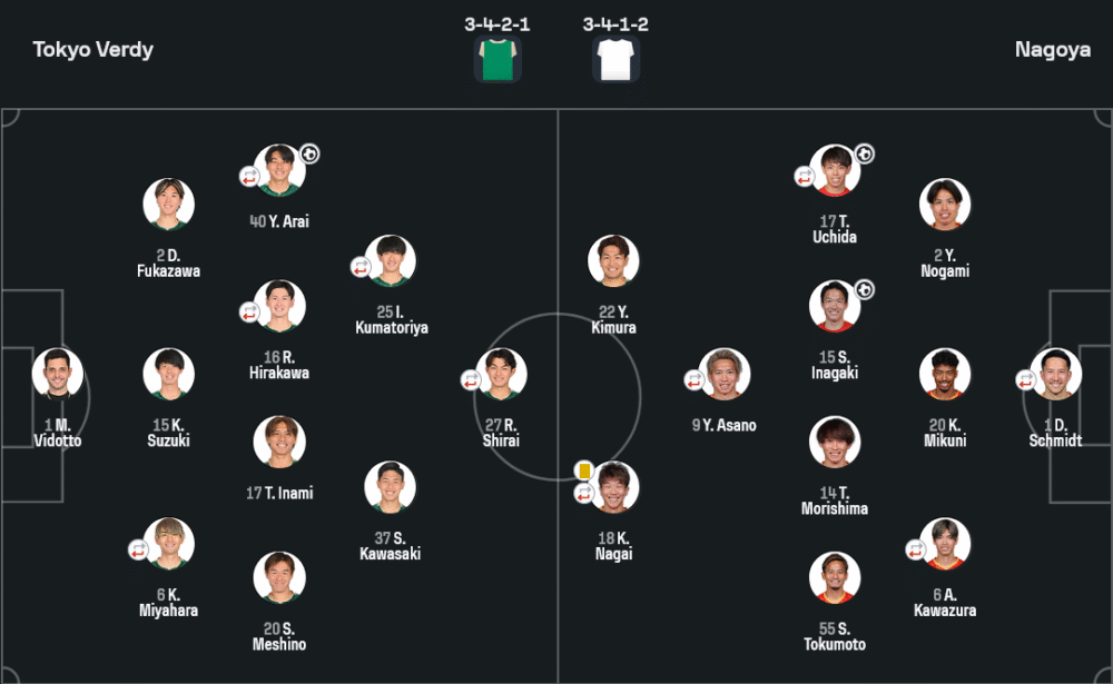 รูปเกมคือหมาก 3-4-2-1 ของเวอร์ดี้ ปะทะ 3-4-1-2 ของนาโกย่า เจ้าถิ่นเน้นคุมบอลและใช้สองเพลย์เมคเกอร์ระหว่างไลน์คอยแทงให้เมชิโนะ ริมเส้นขับด้วยวิงแบ็กขึ้น-ลงต่อเนื่อง แต่จุดอ่อนอยู่ที่การรีเซ็ตเกมรับหลังเสียบอล โดนโต้กลับแล้วถูกเจาะพื้นที่หลังวิงแบ็กบ่อย ด้านนาโกย่าเล่นเป็นระบบ เปลี่ยนสปีดจากช้าไปเร็วได้เฉียบ แดนกลางที่มีอีนางากิคุมจังหวะทำให้การแปรรูปเกมรับสู่เกมรุกไหลลื่น โมริชิมะคอยหุบระหว่างช่องหลังกลาง-แบ็ก เจ้าถิ่นจึงต้องถอยลึกในครึ่งหลัง เมื่อปรับสดด้วยตัวสำรอง ทีมเยือนยิ่งคมในพื้นที่สุดท้ายและบีบจนได้จุดโทษตัดสิน ผลลัพธ์สะท้อนการบ้านชัดเจนตามสไตล์บทความ วิเคราะห์บอล ว่าเวอร์ดี้ต้องอัปเลเวล “ทับซ้อน-ซ้อนทับ” ตอนเสียบอล ส่วนนาโกย่ามีความยืดหยุ่นและความนิ่งในเกมใหญ่