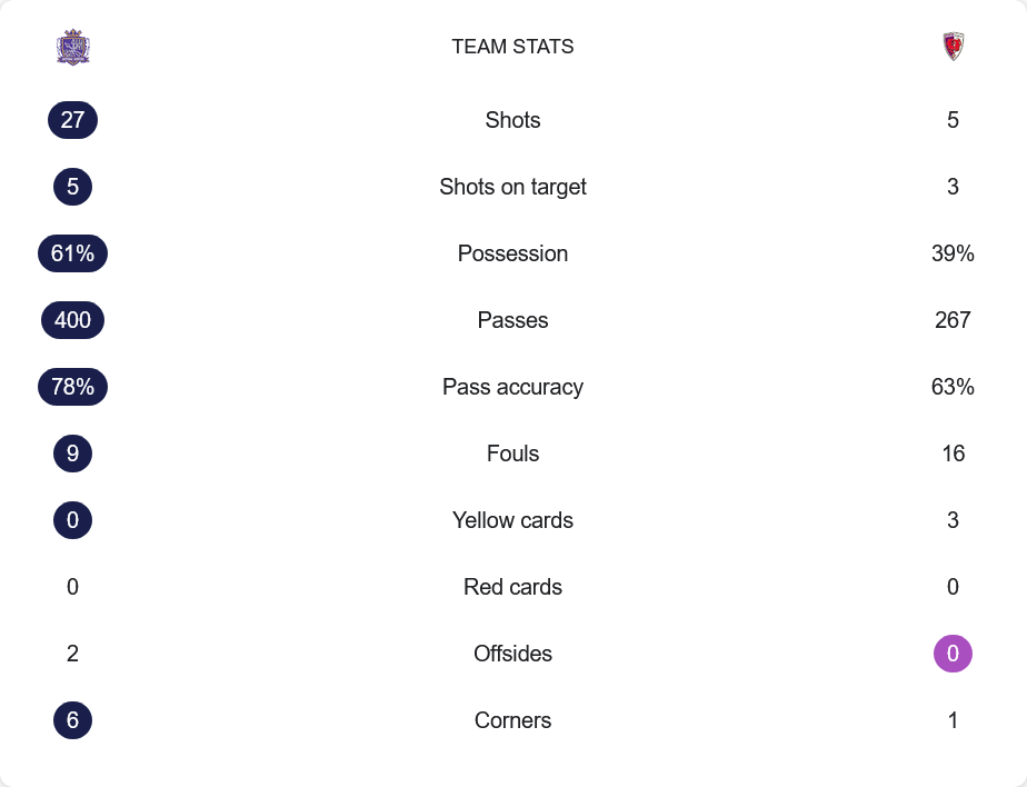 เกมนี้สถิติชี้ชัดว่าซานเฟรซเซเหนือกว่า ครองบอลมากถึง 61% ผ่านบอล 400 ครั้ง ยิง 27 ครั้ง เข้ากรอบ 5 ครั้ง แต่ไม่สามารถปิดเกมได้ ส่วนเกียวโตแม้ครองบอลเพียง 39% ยิงแค่ 5 ครั้ง แต่มี 3 ครั้งที่ตรงกรอบและได้ประตูตีเสมอในช่วงสำคัญ ความแม่นยำในการจบสกอร์คือสิ่งที่ทำให้ทั้งสองทีมต้องแบ่งแต้มกันไป