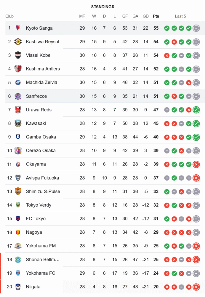 หลังเกมนี้ ซานเฟรซเซ ฮิโรชิม่า เก็บเพิ่ม 1 แต้ม มี 51 คะแนนจาก 30 นัด รั้งอันดับ 6 ของตาราง ส่วนเกียวโต แซงก้า ยังคงนำจ่าฝูงด้วย 55 คะแนนจาก 29 นัด แต่การพลาดชัยชนะนัดนี้ทำให้ช่องว่างกับทีมตามหลังอย่างคาชิวะ เรย์โซล และวิสเซล โกเบ เหลือเพียงแต้มเดียวเท่านั้น การลุ้นแชมป์ บ้านผลบอล ยังคงดุเดือดเข้มข้น