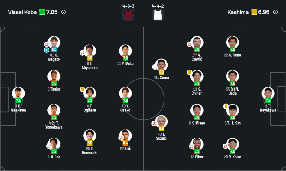 คัตสึยะ นางาโตะ (วิสเซล โกเบ) เรตติ้ง 8.0 ขึ้นลงฝั่งซ้ายทั้งวัน เติมเกมรุกจัดจ้าน ครอสสร้างสรรค์โอกาสต่อเนื่อง แถมเกมรับไล่กดดันจนวิงขวาคู่แข่งเล่นไม่ถนัด มีส่วนสำคัญที่ทำให้โกเบขึงเกมอยู่แดนหน้าเกือบตลอด