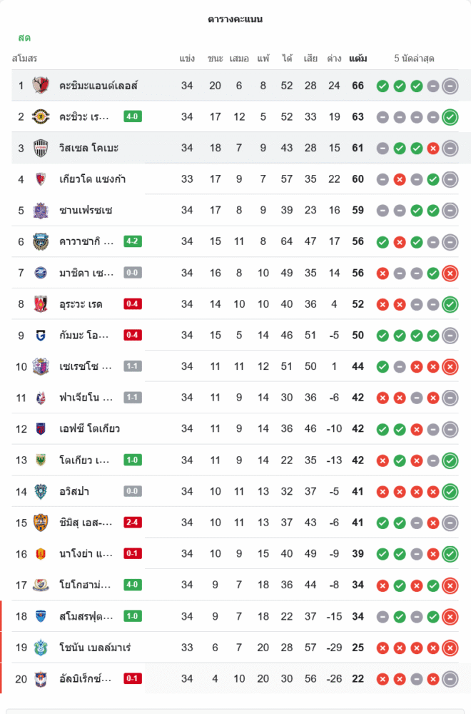 หนึ่งแต้มนี้ทำให้ คาชิม่า แอนท์เลอร์ส เก็บเพิ่มเป็น 66 คะแนน รักษาจ่าฝูงต่อด้วยความกดดันจากทีมไล่หลัง ส่วน วิสเซล โกเบ ขยับเป็น 61 คะแนน ยึดอันดับ 3 ไล่ล่าพื้นที่เอเชียและยังไม่หลุดจากเส้นทางลุ้นแชมป์ หากจังหวะจบคมกว่านี้เกมใหญ่แบบนี้อาจเป็นสามแต้ม