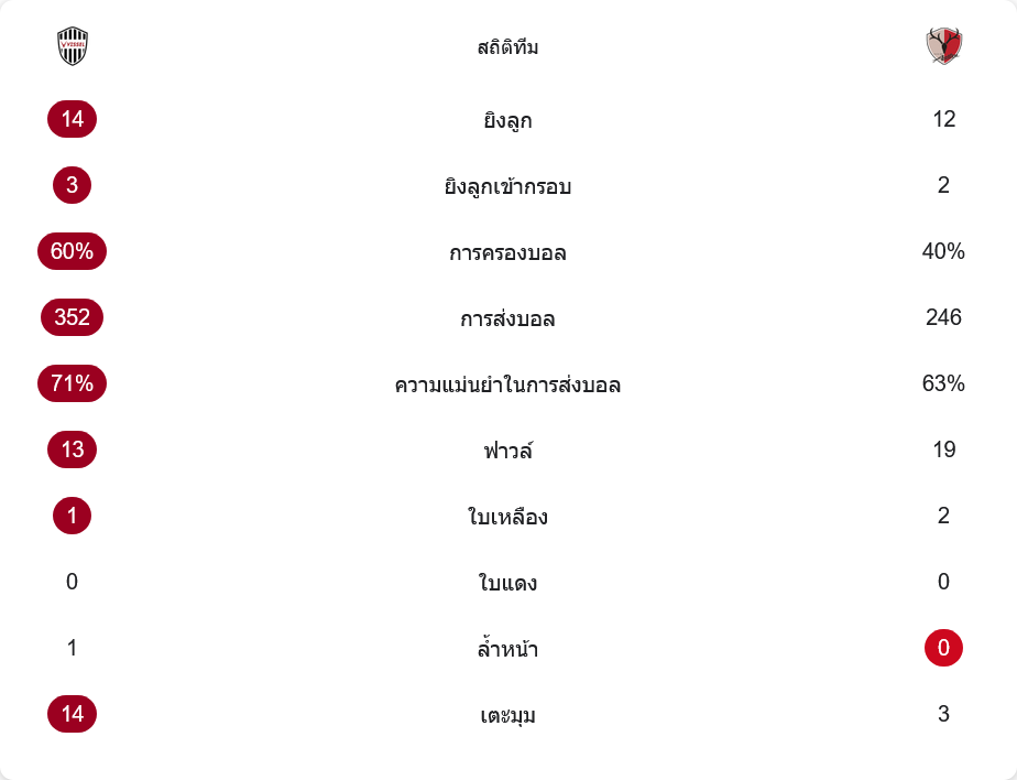 จำนวนยิงสูสี โกเบ 14 ครั้ง เข้ากรอบ 3 ส่วนคาชิม่า 12 ครั้ง เข้ากรอบ 2 เกมไหลไปตามเจ้าบ้านที่ครองบอล 60% จ่ายบอล 352 ต่อ 246 ความแม่นยำ 71% ต่อ 63% ฟาวล์หนักหน่วงทั้งคู่ โกเบ 13 ครั้ง คาชิม่า 19 ครั้ง ใบเหลืองโกเบ 1 ใบ ขณะที่คาชิม่ามี 2 ใบ ลูกล้ำหน้านับได้ 1 ต่อ 0 และลูกเตะมุมสะท้อนการกดดันของโกเบที่สูงถึง 14 ต่อ 3 แต่ก็ยังเจาะตาข่ายไม่ได้