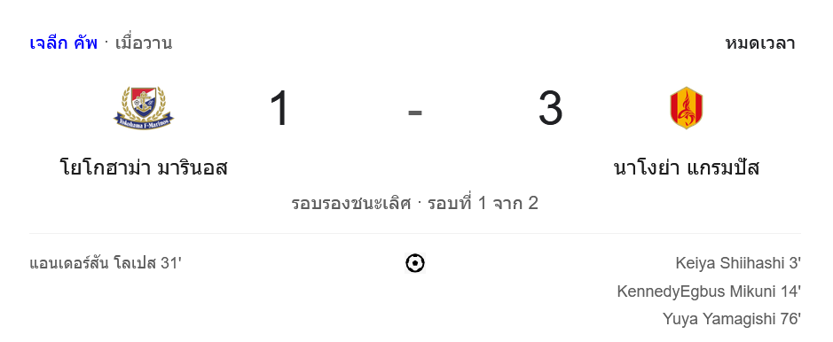 ผลบอลเจลีก คัพ 2024 ระหว่าง ทีมโยโกฮาม่า เอฟ มารินอส vs ทีมนาโกย่า แกรมปัส เอต วันนี้ 10/10/67 ดูบอลย้อนหลัง คลิปไฮไลท์ ดูบอลเจลีก คัพ 2024