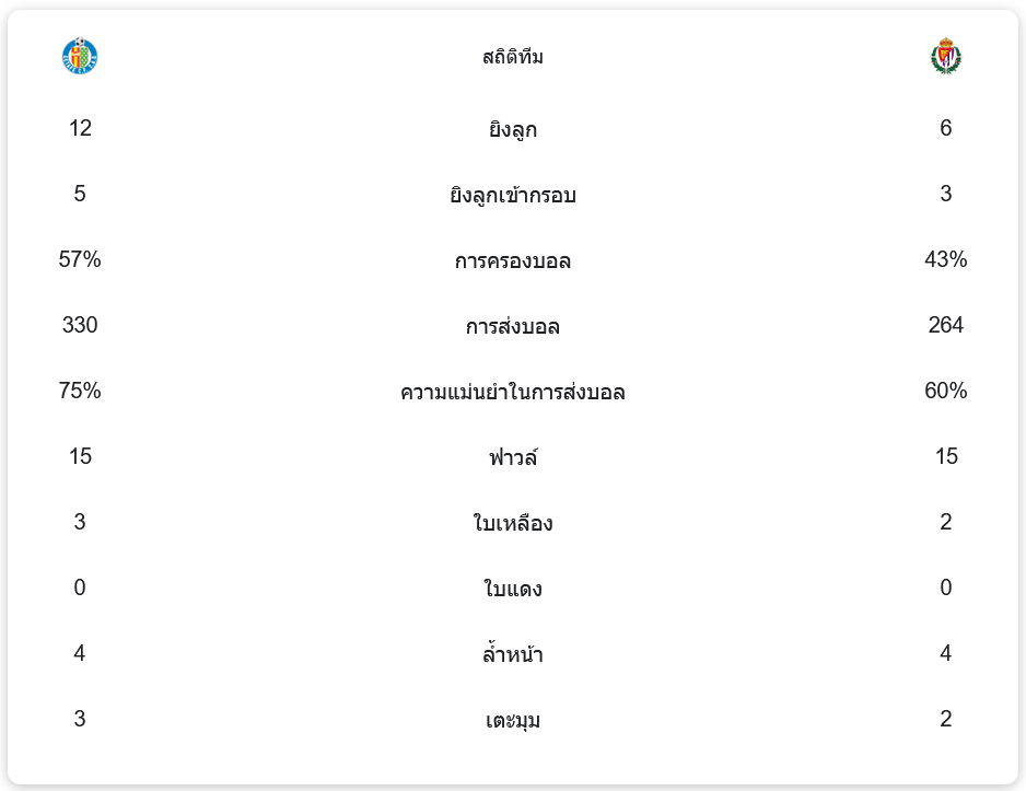 เกมนี้ เกตาเฟ่ ครองบอลได้เหนือกว่า ด้วยอัตราส่วนการครองบอล 57% เมื่อเทียบกับ เรอัล บายาโดลิด ที่ครองบอลเพียง 43% นอกจากนี้ เกตาเฟ่ มีโอกาสยิงรวมถึง 12 ครั้ง โดยยิงเข้ากรอบ 5 ครั้ง ขณะที่ บายาโดลิด ยิงรวม 6 ครั้ง และเข้ากรอบ 3 ครั้ง แสดงให้เห็นถึงความได้เปรียบในเกมรุกของเจ้าบ้าน การผ่านบอลของเกตาเฟ่มีความแม่นยำ 75% จากการผ่านบอลทั้งหมด 330 ครั้ง ซึ่งเหนือกว่าบายาโดลิดที่มีความแม่นยำเพียง 60% จากการผ่านบอล 264 ครั้ง ทั้งสองทีมมีจังหวะฟาวล์เท่ากันที่ 15 ครั้ง โดยเกตาเฟ่ได้รับใบเหลือง 3 ใบ ส่วน บายาโดลิดได้ไป 2 ใบ ด้านลูกเตะมุม เกตาเฟ่ ทำได้ 3 ครั้ง และ บายาโดลิด 2 ครั้ง แต่ในส่วนของลูกล้ำหน้า ทั้งสองทีมต่างสร้างความผิดพลาดในเกมบุกเท่ากันที่ 4 ครั้ง สถิติเหล่านี้ชี้ให้เห็นว่า เกตาเฟ่ มีความเฉียบคมและการครองเกมที่ดีกว่า ส่งผลต่อชัยชนะในนัดนี้อย่างชัดเจน