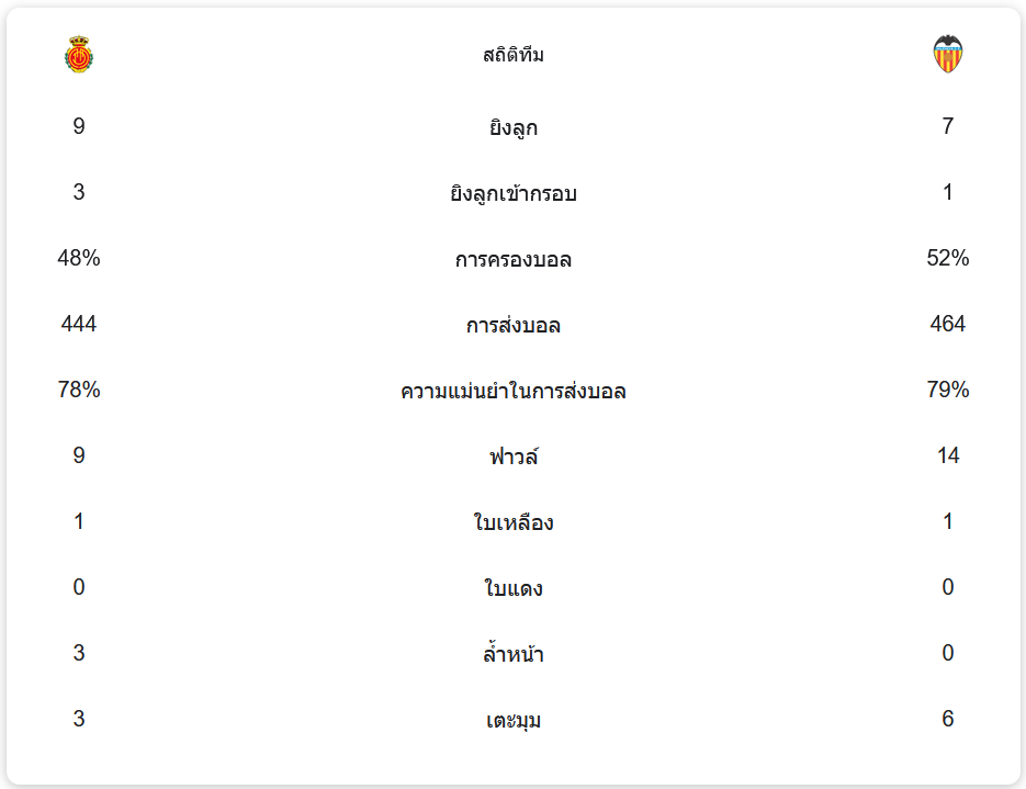 มายอร์ก้ามีโอกาสยิง 9 ครั้ง เข้ากรอบ 3 ครั้ง ครองบอล 48% ขณะที่บาเลนเซียยิง 7 ครั้ง เข้ากรอบ 1 ครั้ง แต่ครองบอลได้มากกว่า 52% การจ่ายบอลแม่นยำของทั้งสองทีมสูสีกัน