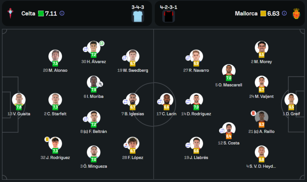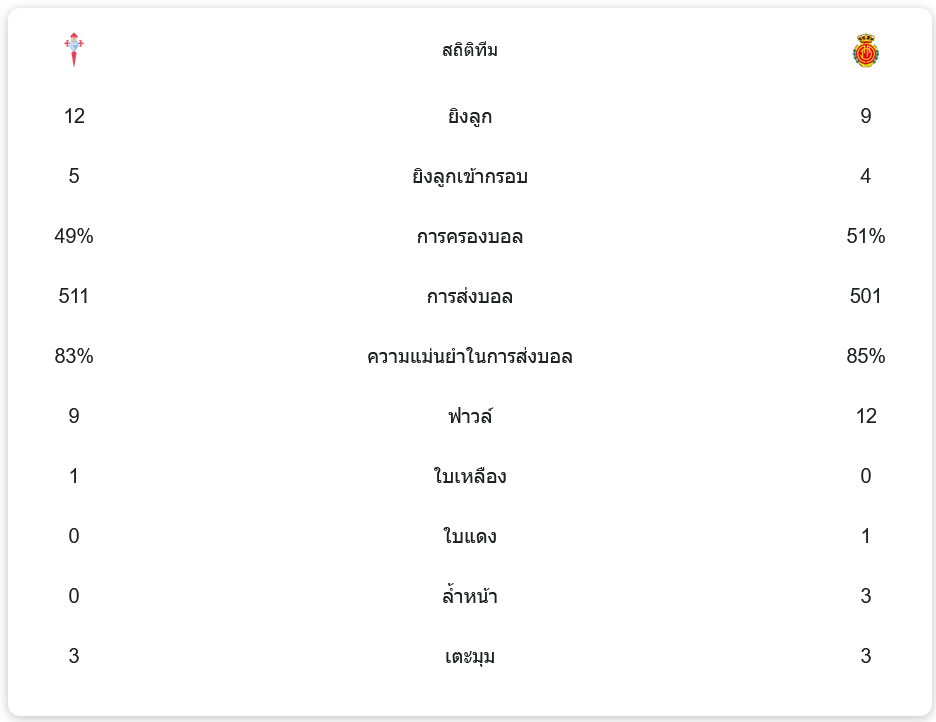 เซลต้ามีโอกาสยิงทั้งหมด 12 ครั้ง เข้ากรอบ 5 ครั้ง ครองบอล 49% และผ่านบอล 511 ครั้งด้วยความแม่นยำ 83% ส่วนมายอร์ก้ามีโอกาสยิง 9 ครั้ง เข้ากรอบ 4 ครั้ง ครองบอล 51% และผ่านบอล 501 ครั้งด้วยความแม่นยำ 85% การแข่งขันครั้งนี้แสดงให้เห็นถึงความแตกต่างของการจบสกอร์ที่เด็ดขาดของเซลต้า