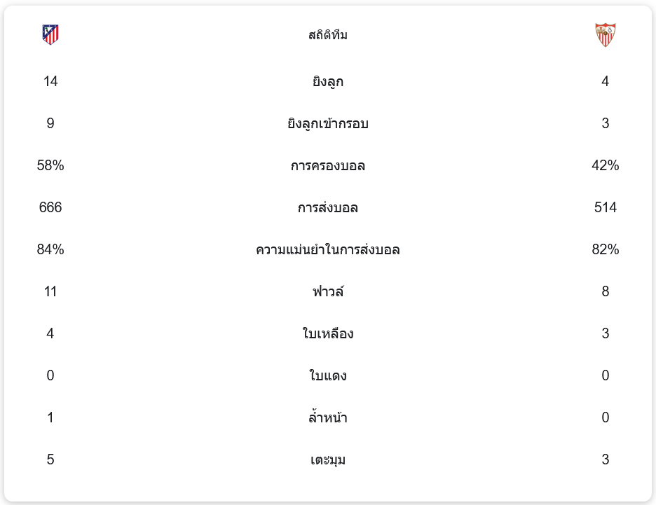 ในเกมนี้ แอตเลติโก มาดริด มีโอกาสยิงทั้งหมด 14 ครั้ง โดยเข้ากรอบ 9 ครั้ง และครองบอล 58% ขณะที่เซบีย่า ยิงทั้งหมด 4 ครั้ง โดยเข้ากรอบ 3 ครั้ง และครองบอล 42% สถิติการจ่ายบอลของแอตเลติโกก็เหนือกว่า โดยจ่ายบอลสำเร็จถึง 84% เทียบกับเซบีย่าที่จ่ายสำเร็จ 82%