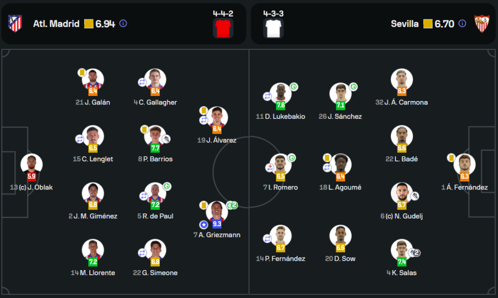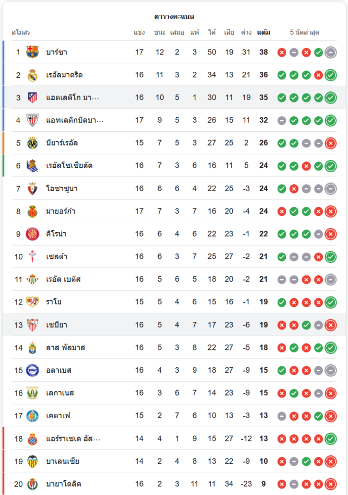 แอตเลติโก มาดริด ยังคงรักษาอันดับที่ 3 ด้วย 35 คะแนนจาก 16 นัด ขณะที่เซบีย่ายังคงอยู่ในอันดับที่ 13 ด้วย 19 คะแนน