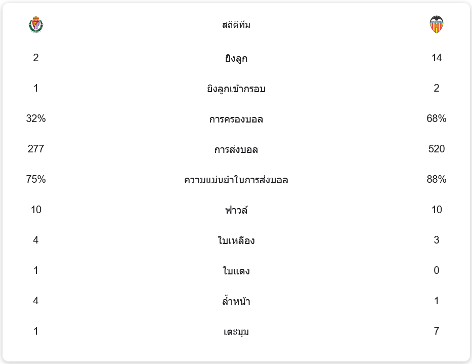 เรอัล บายาโดลิด มีโอกาสยิงเพียง 2 ครั้ง แต่สามารถเปลี่ยนเป็น 1 ประตู ต่างจากบาเลนเซียที่ยิงถึง 14 ครั้งแต่ไร้ผล การครองบอลบาเลนเซียเหนือกว่าถึง 68% และผ่านบอลได้แม่นยำกว่า 88% เทียบกับ 75% ของเจ้าบ้าน