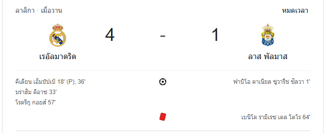 แม้ ลาส พัลมาส จะพยายามลดความเสียหาย แต่ก็ไม่อาจหยุดยั้งเกมรุกอันดุดันของมาดริดได้ จบเกม ราชันชุดขาวเก็บ 3 แต้มสำคัญด้วยชัยชนะ 4-1