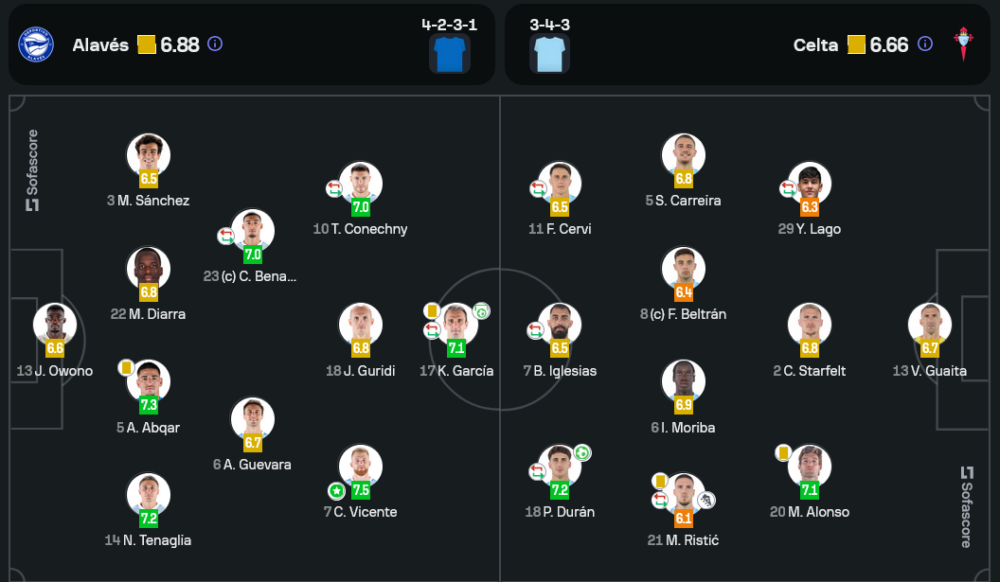 เกมนี้ อลาเบส ใช้แผน 4-2-3-1 เน้นการครองบอลและสวนกลับเร็ว โดยใช้ คาร์ลอส วิเซนเต้ เป็นตัวขับเคลื่อนเกมรุก ขณะที่ เซลต้า มาในระบบ 3-4-3 ที่เน้นการโจมตีจากริมเส้นและการเคลื่อนที่ของกองกลางในแนวลึก ทั้งสองทีมมีความแม่นยำในการส่งบอลที่ 78% เท่ากัน แต่จังหวะเข้าทำของ เซลต้า ดูจะมีประสิทธิภาพกว่าเล็กน้อย