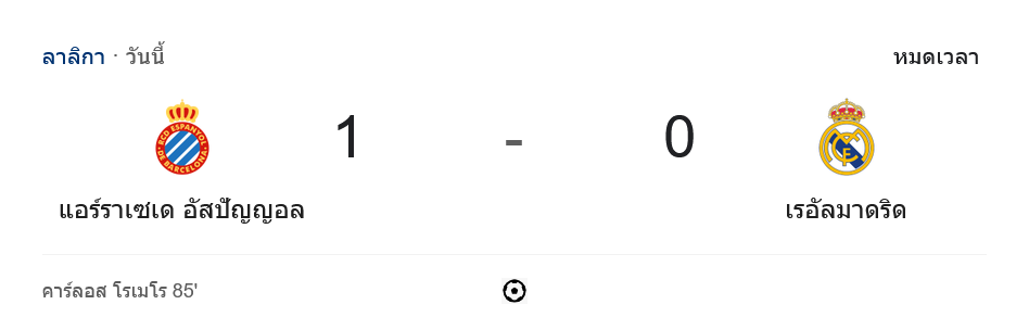 แม้มาดริดจะพยายามอย่างเต็มที่ในช่วงเวลาที่เหลือ แต่ไม่สามารถเจาะแนวรับของเอสปันญ่อลได้ จบเกม เอสปันญ่อล เฉือนชนะไป 1-0 อย่างสุดมันส์