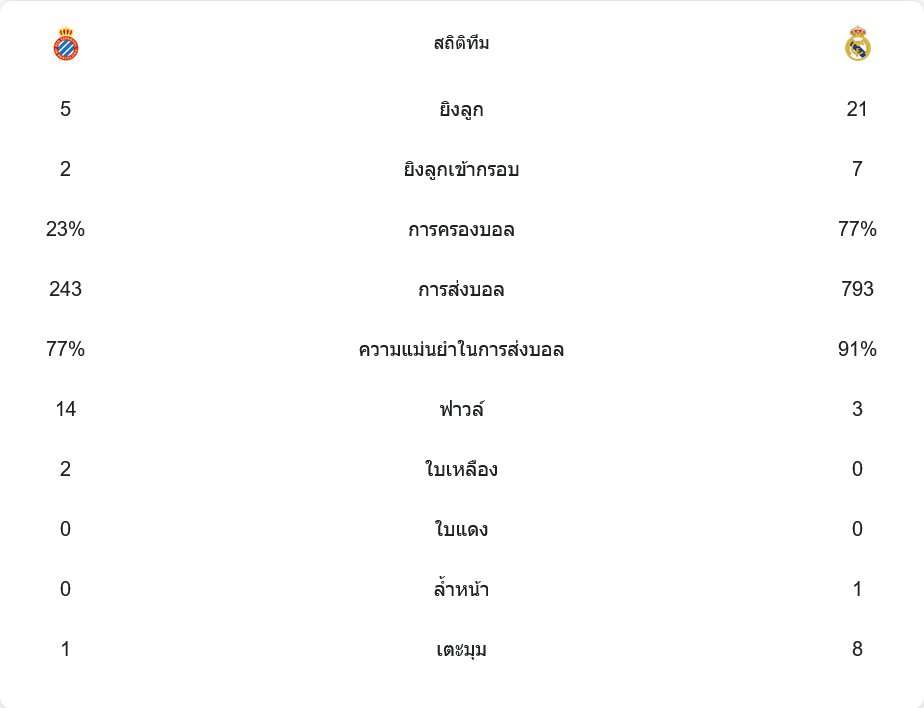 - การครองบอล: เอสปันญ่อล 23% – 77% เรอัล มาดริด
