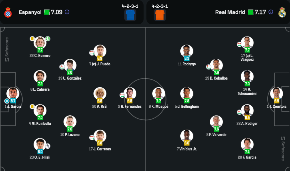 - กองกลาง: ออเรเลียง ชูอาเมนี่ (7.0), จู๊ด เบลลิงแฮม (7.8), ดานี่ เซบาญอส (7.6)