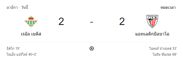 นาทีที่ 96: กรรมการเป่านกหวีดจบเกม เรอัล เบติสเสมอกับแอธเลติก คลับ 2-2