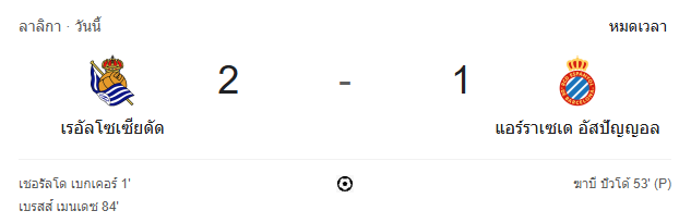 - นาทีที่ 96 กรรมการเป่านกหวีดจบเกม เรอัล โซเซียดาดเอาชนะเอสปันญ่อล 2-1