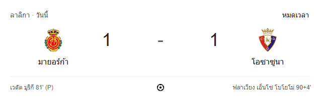 - นาทีที่ 100 กรรมการเป่านกหวีดจบเกม มายอร์ก้าเสมอโอซาซูน่า 1-1