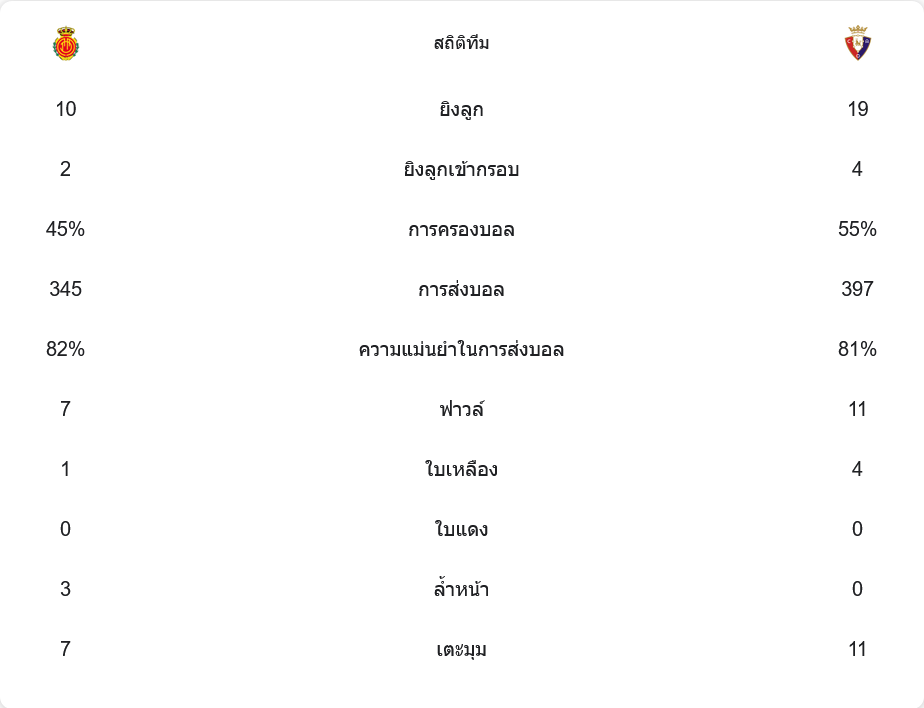 การส่งบอลของโอซาซูน่าก็ทำได้ดีกว่า มีจำนวนการจ่ายบอล 397 ครั้ง และมีอัตราความแม่นยำ 81% เทียบกับมายอร์ก้าที่ผ่านบอล 345 ครั้ง ด้วยความแม่นยำ 82%