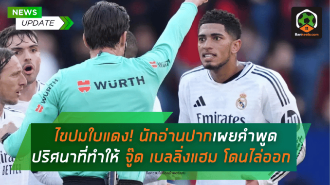 จู๊ด เบลลิ่งแฮม มิดฟิลด์ตัวเก่งของ เรอัล มาดริด กลายเป็นประเด็นร้อนในศึก ลา ลีกา สเปน หลังถูกผู้ตัดสินชูใบแดงไล่ออกจากสนามโดยตรง ในเกมที่ ราชันชุดขาว บุกไปเสมอกับ โอซาซูน่า 1-1 เมื่อคืนวันเสาร์ที่ 15 กุมภาพันธ์ที่ผ่านมา ซึ่งหลังจบเกม นักอ่านปากมืออาชีพได้ออกมาเปิดเผยคำพูดของแข้งอังกฤษที่ทำให้เขาถูกไล่ออกแบบสุดช็อก