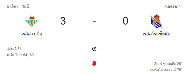 - นาทีที่ 94 หมดเวลาการแข่งขัน เรอัล เบติส 3-0 เรอัล โซเซียดาด เจ้าบ้านโชว์ฟอร์มดุดันเก็บสามแต้มไปแบบสุดมันส์!