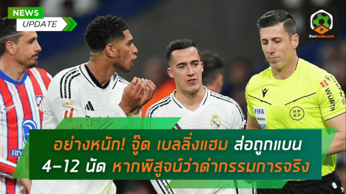 สื่อดังจากสเปนรายงานว่า จู๊ด เบลลิ่งแฮม มิดฟิลด์ตัวเก่งของ เรอัล มาดริด อาจต้องเผชิญบทลงโทษขั้นรุนแรงจากการได้รับ ใบแดง ในนัดที่ “ราชันชุดขาว” บุกไปเสมอ โอซาซูน่า 1-1 ในศึก ลา ลีกา สเปน เมื่อวันเสาร์ที่ผ่านมา ซึ่งโทษขั้นต่ำที่เขาอาจได้รับคือการ แบน 4 นัด และอาจหนักถึง 12 นัด หากถูกตัดสินว่ามีพฤติกรรมดูหมิ่นผู้ตัดสิน