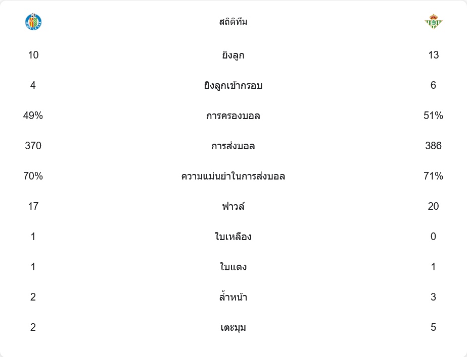 แม้จะมีเปอร์เซ็นต์ครองบอลใกล้เคียงกัน (51%-49%) แต่ เรอัล เบติส มีโอกาสยิงมากกว่า (13-10) และยิงเข้ากรอบถึง 6 ครั้ง เทียบกับ เกตาเฟ่ ที่ยิงเข้ากรอบเพียง 4 ครั้ง เกมนี้มีจังหวะฟาวล์รวม 37 ครั้ง โดยที่ โดมิงกอส ดูอาร์เต้ ของเกตาเฟ่โดนใบแดงในช่วงทดเวลาบาดเจ็บ