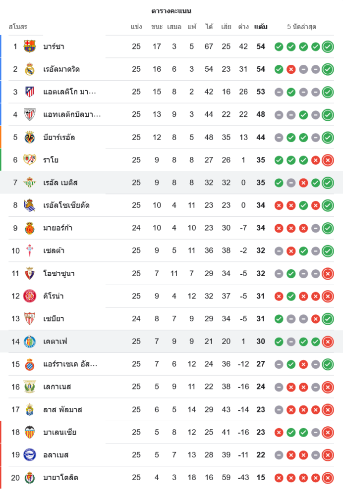 ชัยชนะของ เรอัล เบติส ทำให้พวกเขามี 35 คะแนน เท่ากับ ราโย บาเยกาโน่ ขึ้นมารั้งอันดับ 7 ขณะที่ เกตาเฟ่ ยังคงอยู่ที่ อันดับ 14 มี 30 คะแนน ห่างโซนตกชั้น 6 แต้ม