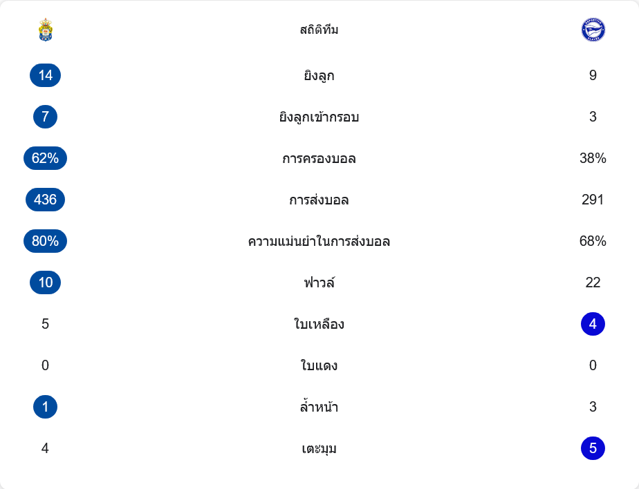 ลาส พัลมาส คุมเกมได้มากกว่าด้วยการครองบอลถึง 62% และผ่านบอลแม่นยำ 80% แต่กลับต้องไล่ตามถึงสองประตู ส่วน อลาเบส แม้จะครองบอลน้อย แต่มีเกมสวนกลับที่เฉียบคม และใช้โอกาสที่มีได้อย่างคุ้มค่า