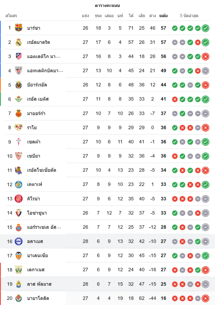 การเสมอของ ลาส พัลมาส ทำให้พวกเขายังอยู่ในโซนล่างของตาราง มี 25 คะแนน จาก 28 นัด ห่างจากโซนตกชั้นเพียง 2 แต้ม ส่วน อลาเบส เก็บเพิ่มเป็น 27 คะแนน อยู่อันดับ 16 ห่างจากโซนตกชั้นแค่ 1 คะแนน