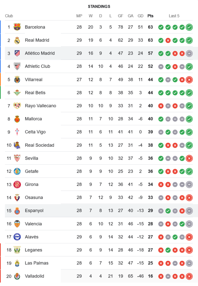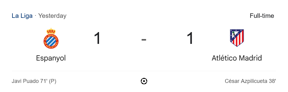 การเสมอครั้งนี้ทำให้ แอตเลติโก้ มาดริด เก็บเพิ่มอีก 1 คะแนน มี 57 คะแนน รั้งอันดับ 3 ขณะที่ เอสปันญ่อล ยังอยู่ในโซนตกชั้นที่อันดับ 15 ด้วย 29 คะแนน ต้องเร่งพัฒนาฟอร์มการเล่นเพื่อหนีจากโซนอันตรายนี้ให้ได้