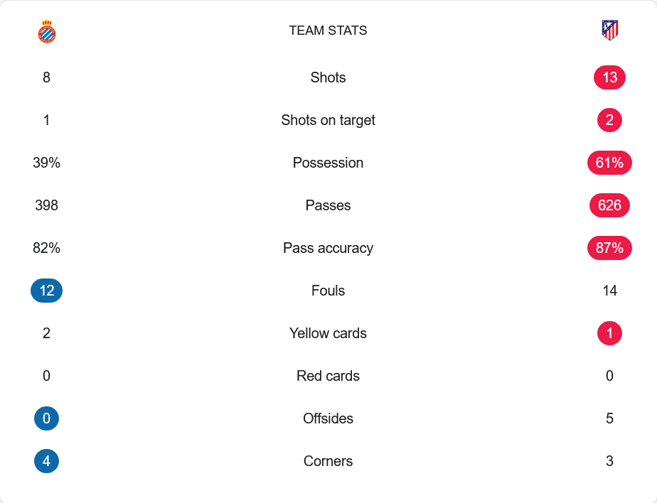 ส่วน แอตเลติโก้ มาดริด มาในแผน 4-4-2 ที่เน้นการครองบอลและการต่อบอลอย่างแม่นยำ ด้วยการผ่านบอลที่มากถึง 626 ครั้ง แต่การที่ยิงเข้ากรอบเพียง 2 ครั้ง จาก 13 ครั้ง แสดงให้เห็นถึงความผิดพลาดในการจบสกอร์ ซึ่งเป็นจุดที่ต้องปรับปรุงหากพวกเขาต้องการเก็บชัยชนะในเกมต่อไป