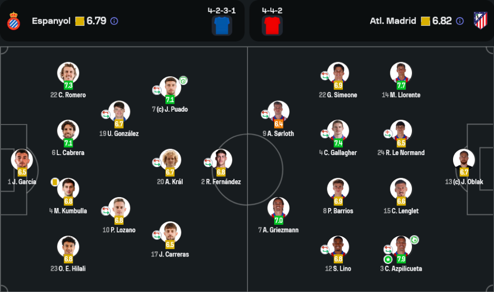 A. Sørloth ออก <sub>(64’)</sub> แทนโดย J. Álvarez