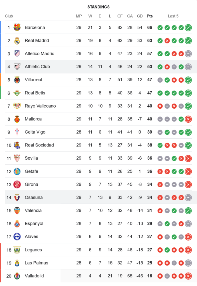 แอธเลติก บิลเบา ยังคงอยู่อันดับ 4 มี 53 แต้ม จาก 29 นัด ส่วนโอซาซูน่า อยู่อันดับ 14 มี 34 แต้มจาก 29 นัดเช่นกัน แต้มนี้ถือว่าสำคัญสำหรับการหนีพื้นที่ท้ายตารางของทีมเยือน
