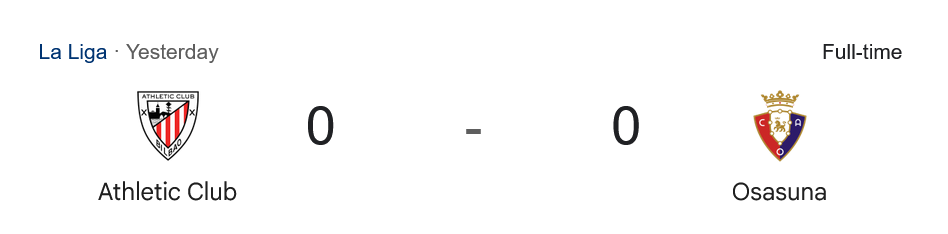 บ้านกีฬา รายงานสดจาก บ้านผลบอล หลังเกมสุดเข้มข้นในศึก ลาลิกา 2025 คู่ระหว่าง แอธเลติก บิลเบา เปิดบ้านต้อนรับ โอซาซูน่า ที่สังเวียน ซาน มาเมส เมื่อคืนที่ผ่านมา ผลปรากฏว่าทั้งสองทีมยังคงทำอะไรกันไม่ได้ จบลงด้วยผลเสมอ 0-0 แบ่งกันไปทีมละหนึ่งแต้มแบบไร้สกอร์ แม้ตลอดเกมจะมีโอกาสลุ้นทำประตูแบบสุดมัน ตามที่แฟนบอลได้ลุ้นติดตามจาก ผลบอลสด