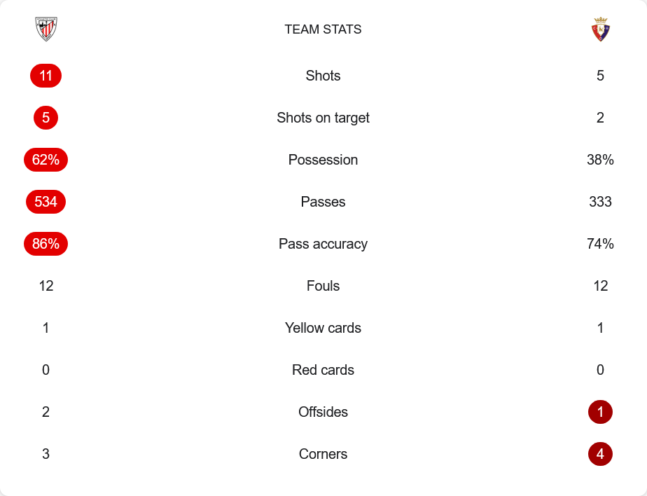 แอธเลติก บิลเบา ครองบอลได้เหนือกว่าด้วยสัดส่วนถึง 62% มีโอกาสยิงทั้งหมด 11 ครั้ง ตรงกรอบ 5 ครั้ง ขณะที่โอซาซูน่า ยิง 5 ครั้ง ตรงกรอบเพียง 2 ครั้งเท่านั้น แอธเลติก บิลเบา ผ่านบอลรวม 534 ครั้ง มีความแม่นยำถึง 86% ส่วนโอซาซูน่า ผ่านบอล 333 ครั้ง แม่นยำเพียง 74% เท่านั้น ทั้งสองทีมทำฟาวล์เท่ากันที่ 12 ครั้ง และได้ใบเหลืองฝั่งละหนึ่งใบ ไม่มีใบแดงในเกมนี้