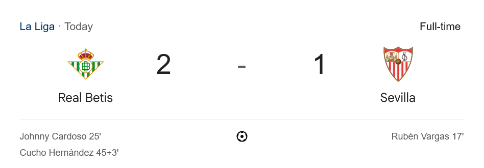 บ้านผลบอล สรุปหลังเกม ศึกแห่งศักดิ์ศรี! เรอัล เบติส เปิดบ้านเฉือน เซบีย่า 2-1 ดาร์บี้แมตช์สุดเดือด ลาลีกา 2025