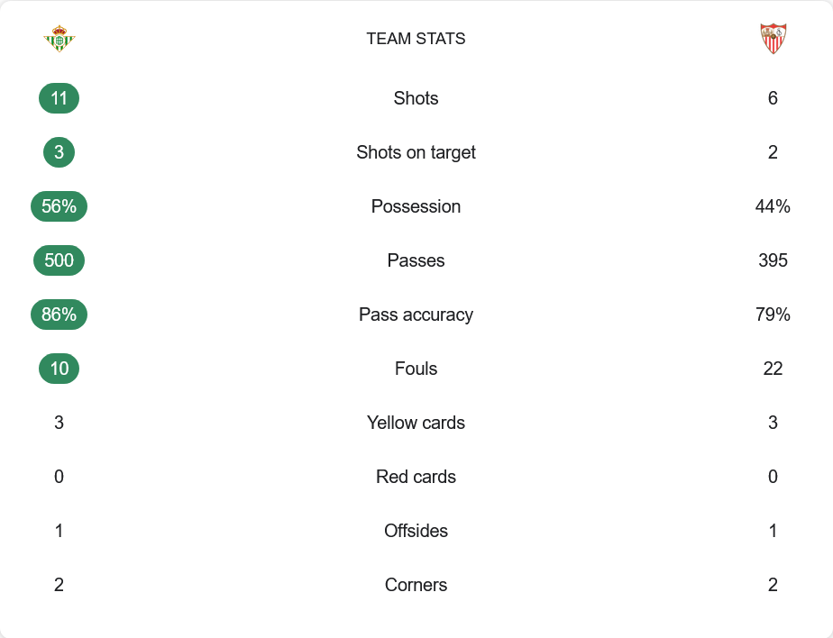 เบติส ทำผลงานได้เหนือกว่า ด้วยการครองบอลถึง 56% และสร้างโอกาสยิงไป 11 ครั้ง เข้ากรอบ 3 ครั้ง ขณะที่ เซบีย่า ยิงได้แค่ 6 ครั้ง เข้ากรอบเพียง 2 ครั้ง การผ่านบอล เบติส ก็เหนือกว่าชัดเจน ด้วยจำนวน 500 ครั้ง แม่นยำถึง 86% ส่วน เซบีย่า ผ่านบอลแค่ 395 ครั้ง ความแม่นยำต่ำกว่าอยู่ที่ 79%